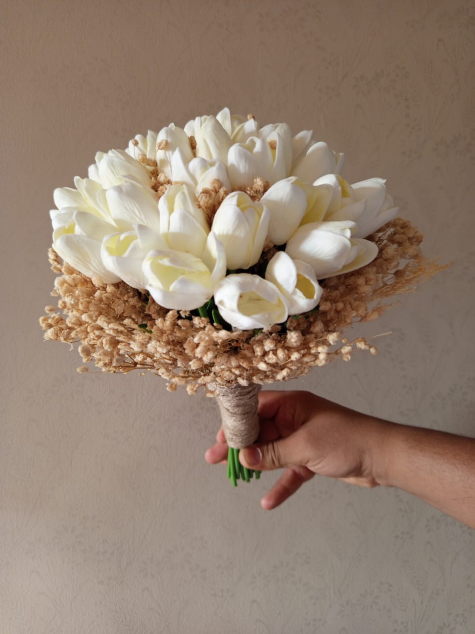 بوكيه فاخر مكوّن من 30 زهرة تيوليب صناعي مستوردة باللون الأبيض، محاطة بطبقة من البيبي فلاور المجفف بلونه البيج الطبيعي، ومثبتة بيد مغلفة بخيط الكتان. تصميم ناعم وراقي، مثالي للعروسة، للتصوير، أو كهدية مميزة تدوم.