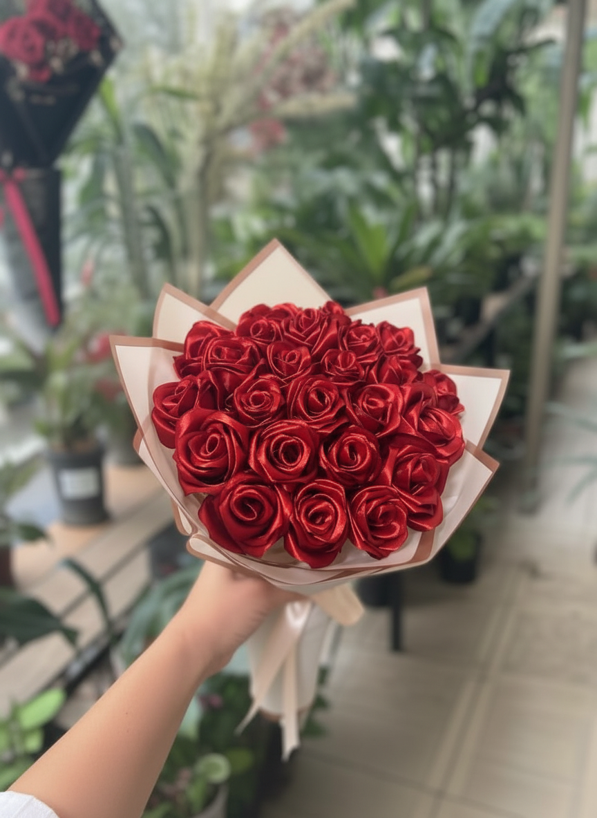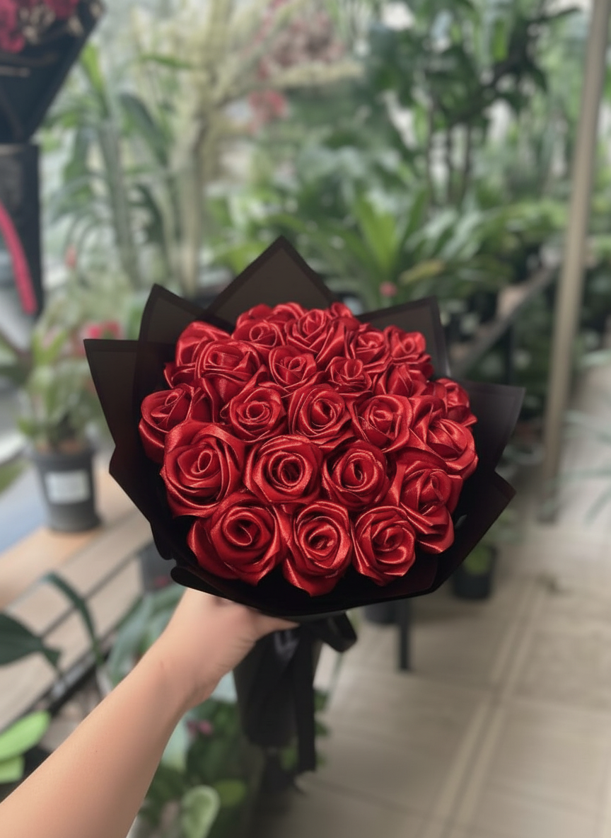 بوكيه ورد أحمر فاخر مصنوع من ورد ستان فخم يشبه الورد الطبيعي، منسق بعناية في تغليف أنيق متاح باللون الأسود أو الأبيض، مع شريط ساتان يضيف لمسة من الفخامة والرقي.